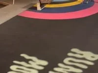 Floodlines is a public artwork located in Brisbane Australia. The brightly coloured work includes a mural to the underside of the Riverside Expressway, a soft fall ground plane, brightly coloured gym equipment and night activated lighting elements. The predominantly graphic work, with sub-tropical colour palette, is inspired by marble patterns synonymous with the cover pages and book spines of historical volumes and records. Ink which is mixed with water to create this traditional marble effect is abstracted and controlled by water, which was a key inspiration for Lang in seeking to evoke memories and notions of record keeping, and to depict traces of Brisbane’s 2010-11 flood. A line of symmetry within the pattern indicates the 2011 flood peak level. The painted pattern pools around the base of each pillar and ripples across the ground to create a vibrant pattern on which playful texts describing speech, processes and sounds related to water are projected at night. Using a bright, subtropical palette, Lang’s playful work evidences an event in time, inviting people to reflect on the city’s history and its relationship to the natural environment.